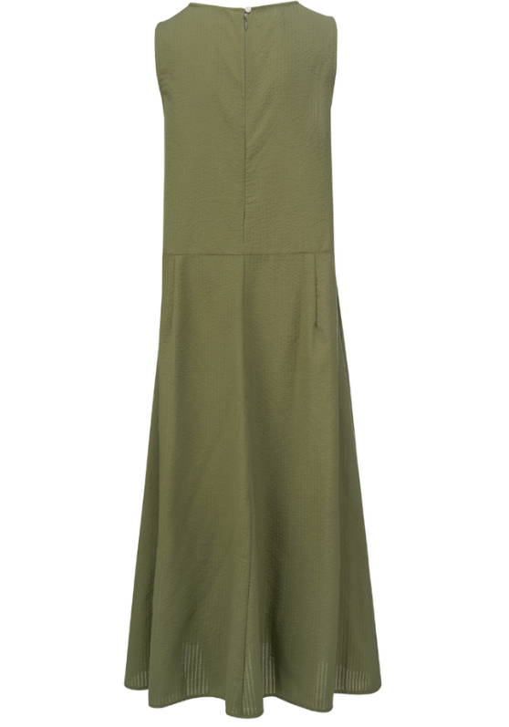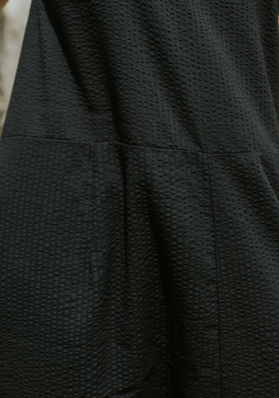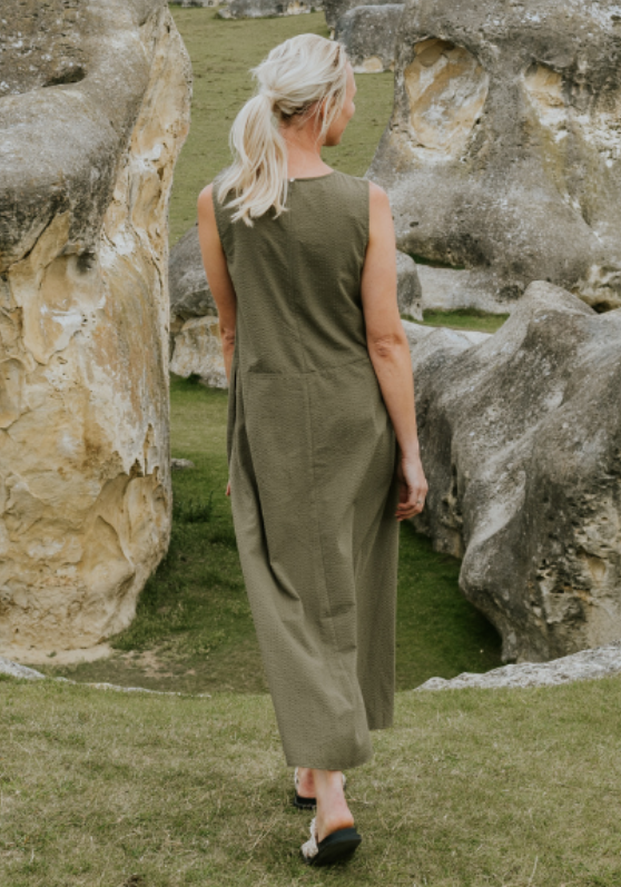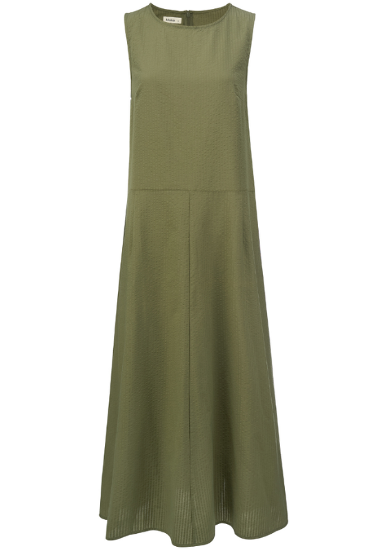 The drop-waist silhouette gently skims the body before falling into a paneled skirt that adds movement without bulk. A classic crew neckline keeps things clean and balanced, while the zip-and-button closure at the back offers a neat, secure fit. Thoughtful side pockets add everyday ease - because practicality should always feel this good.