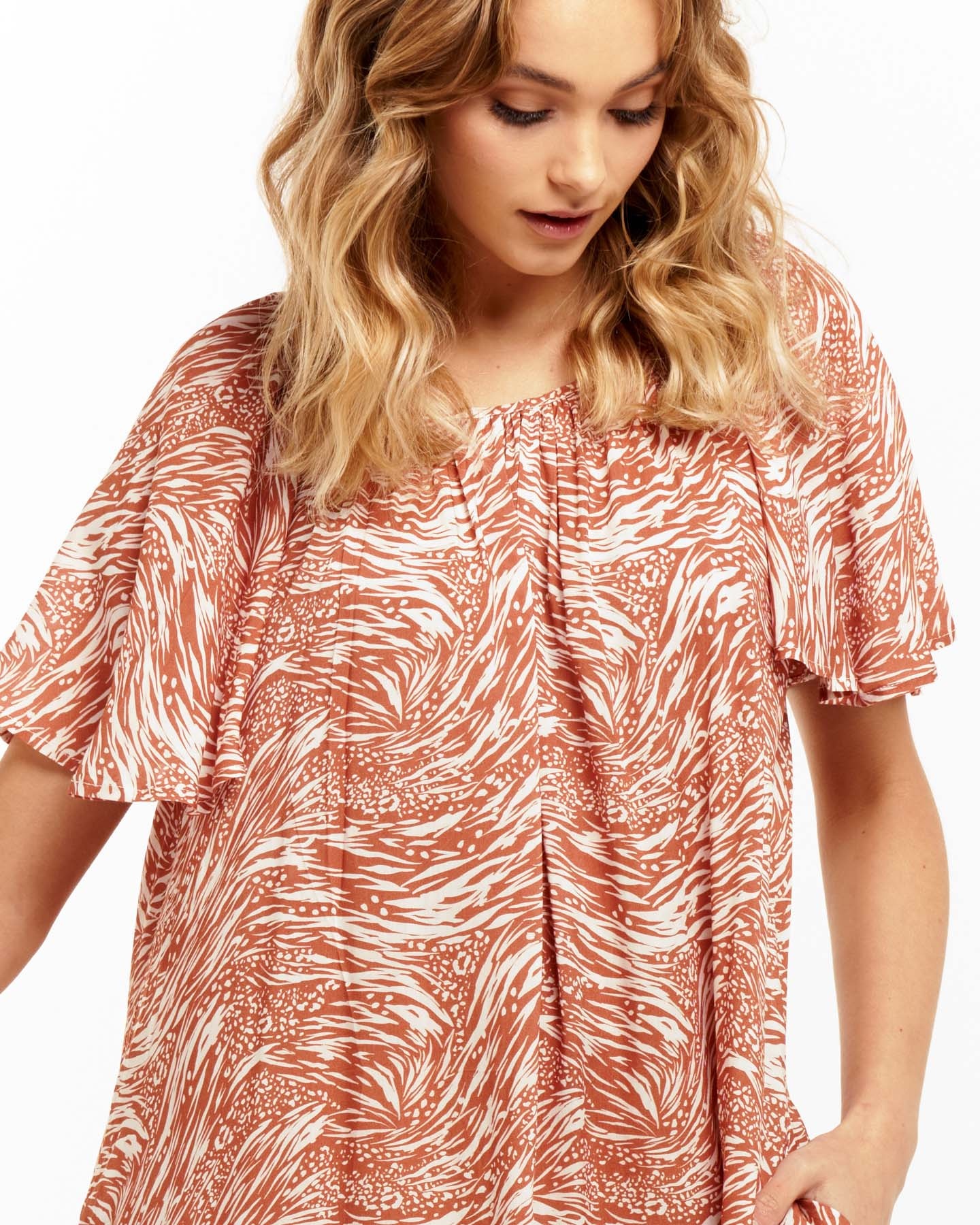 Wow, this dress is pretty — Made of light-as-air rayon, this easy fit dress has swingy flutter sleeves that flatters the arms. Spencer is the perfect with sneakers or sandals or take her on a night out in your favourite heels