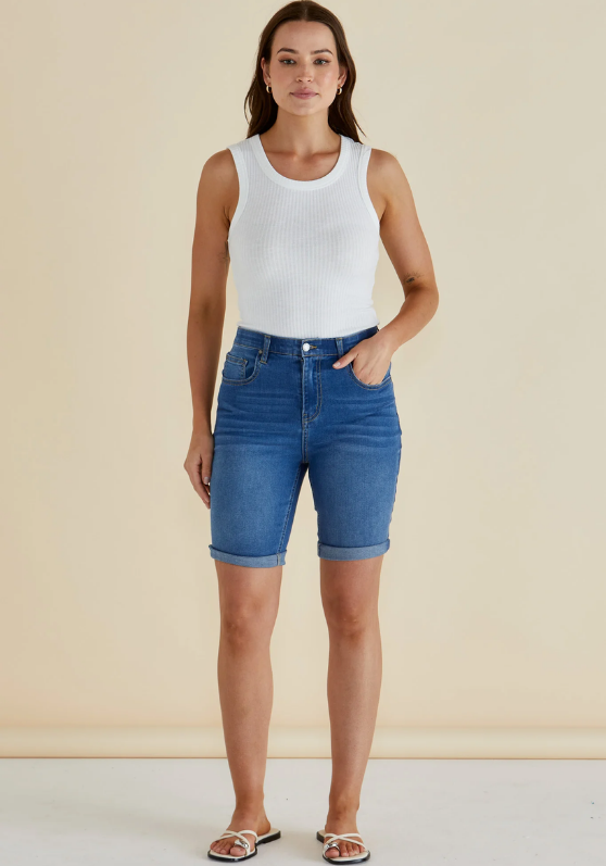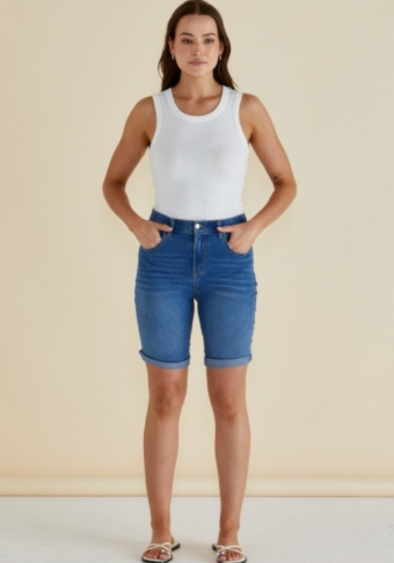 The Bonnie Bermuda Denim - your go-to for a relaxed and stylish look! With a mid-high rise fit, a fitted design through the waist, hip, and thigh, functional pockets, and stretch fabric for comfort, these denim shorts are perfect for those laid-back, fun, and effortlessly chic days. Elevate your wardrobe with the Bonnie Bermuda Denim for the perfect blend of fashion and comfort.