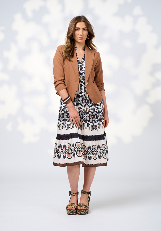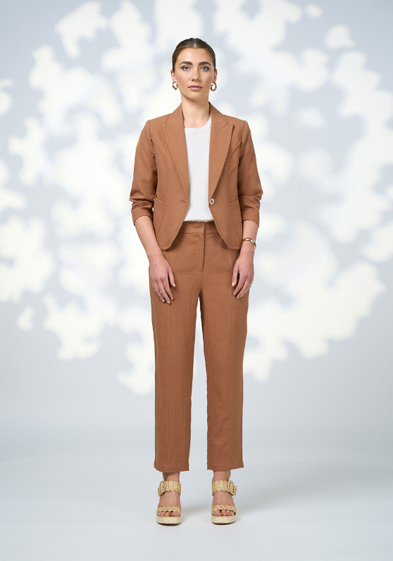 Fitted short-line jacket in textered herringbone with waist shaping,  front pockets and panels. Featuring zig zag embroidery and piping edging detail. Fully lined.