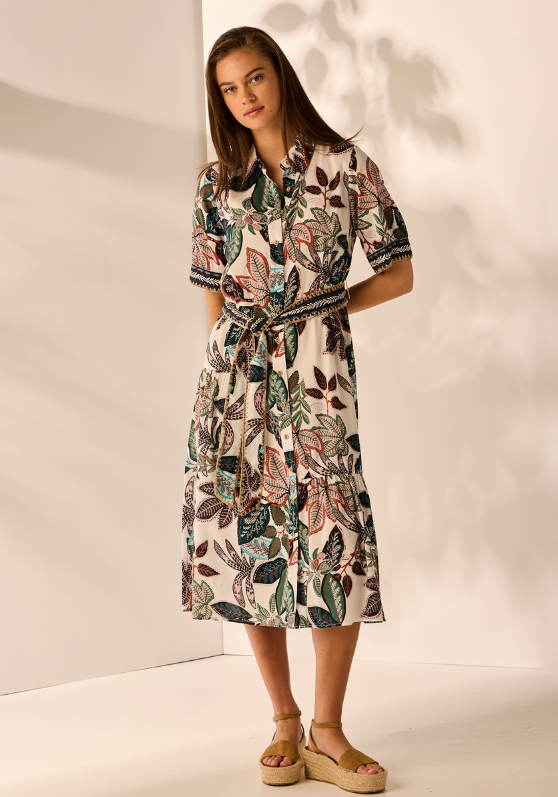 The Carnaby Dress is a perfect balance of elegance and artisanal charm, featuring a mid-calf length silhouette with a flowing high-low gathered hem. Thoughtful details like blanket stitch embroidery on the belt and cuffs, a border print accent, and a centre-front placket with wooden buttons make this a standout piece for effortless styling.