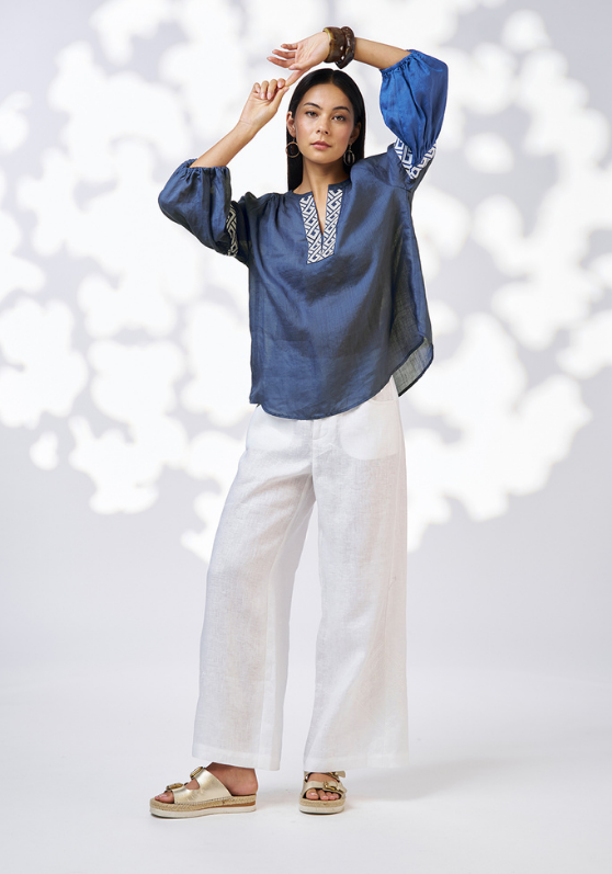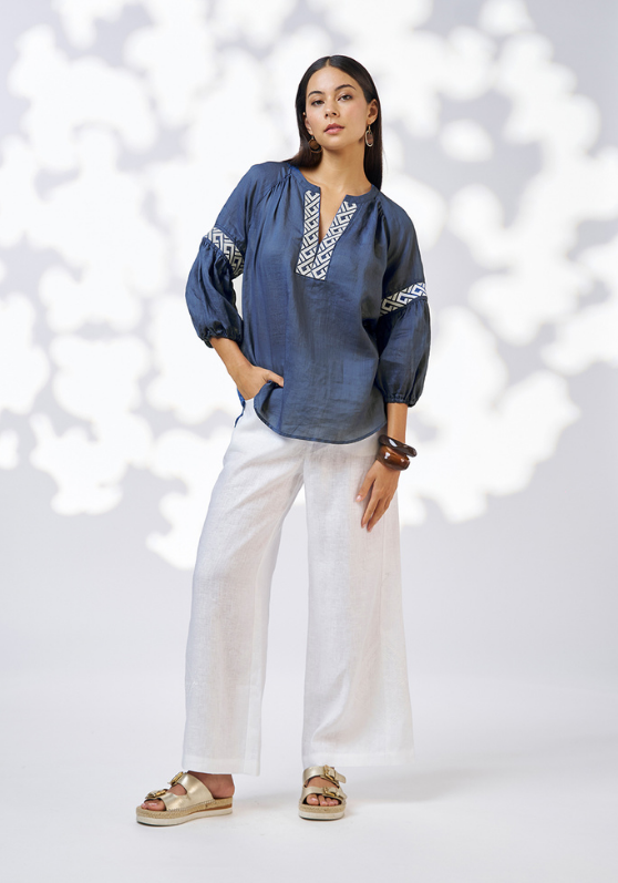 Ramie blouse with a V-neckline, featuring contrast embroidery detail around neckline and sleeve panels. Sleeves gather into a turned back elasticated cuff.