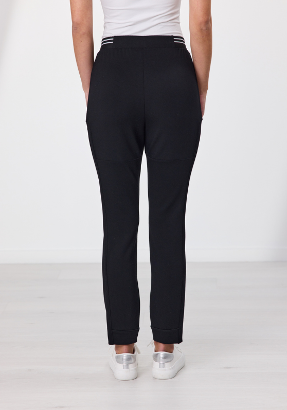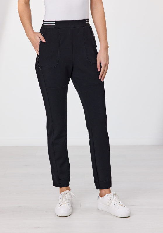 Pull on, full length jogger pant with contrasting stripe elastic waistband. Leg panel detail and zip pockets.