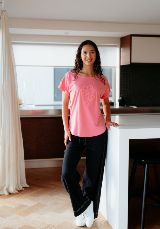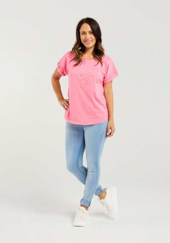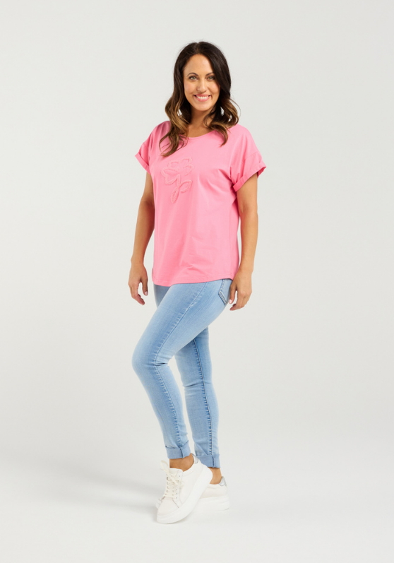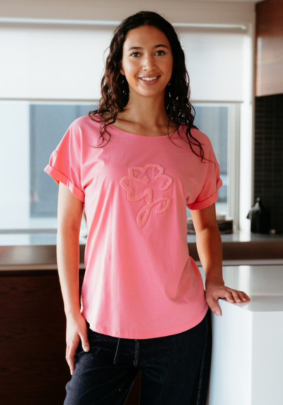 This top features a beautiful effortless fit with folded short sleeves and a fluffy print for added flair.