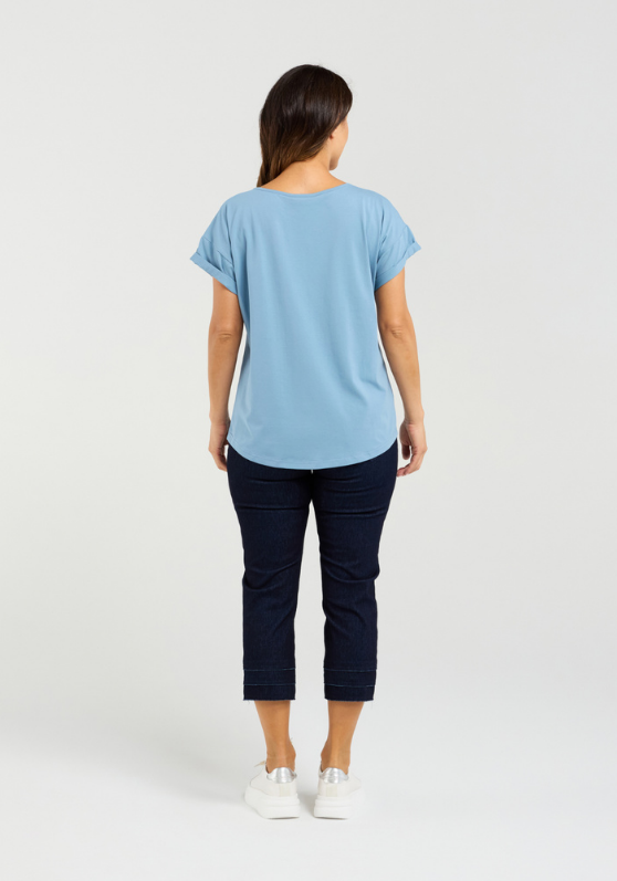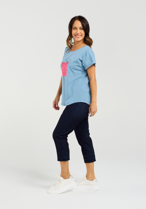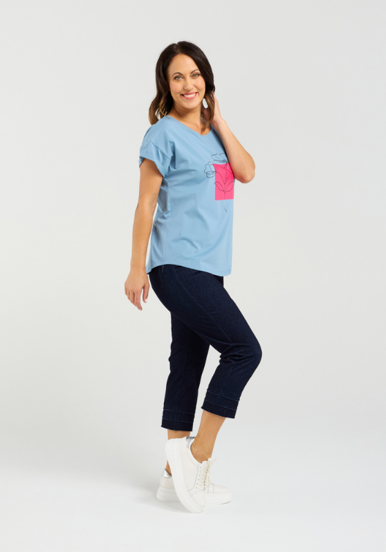 This top features a beautiful effortless fit with folded short sleeves and a contrast print for added flair.