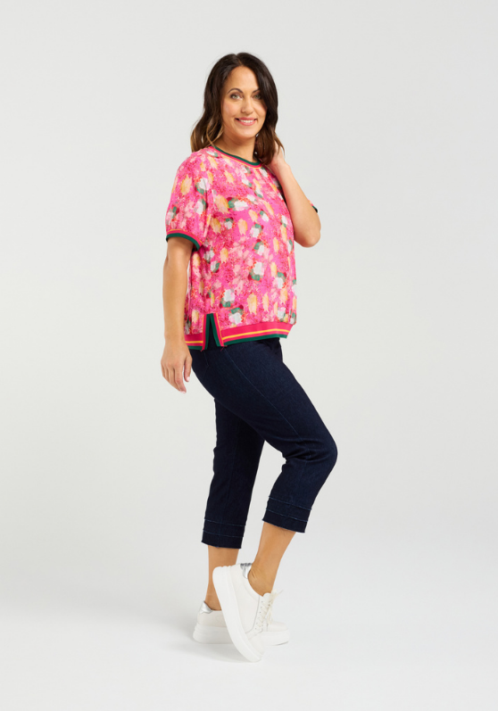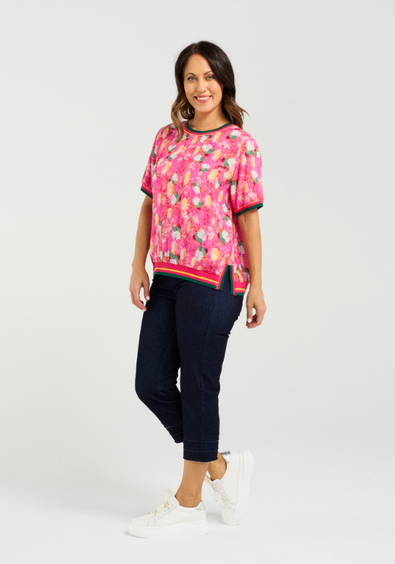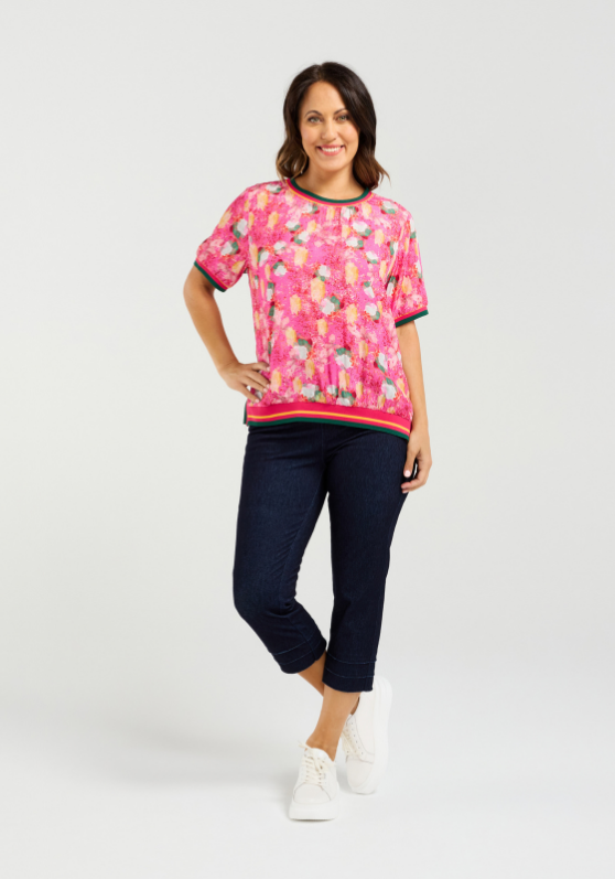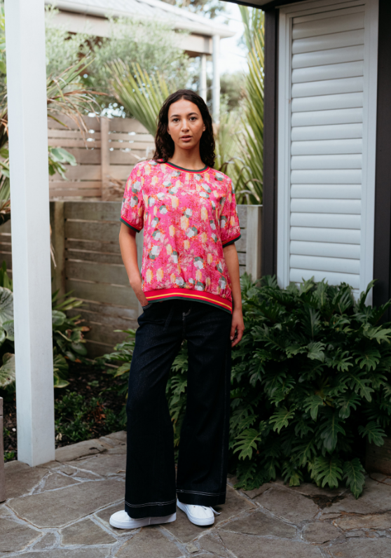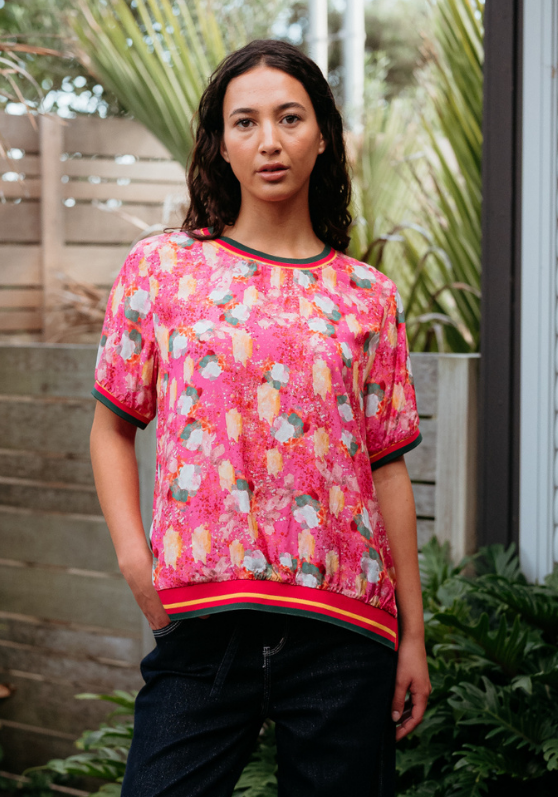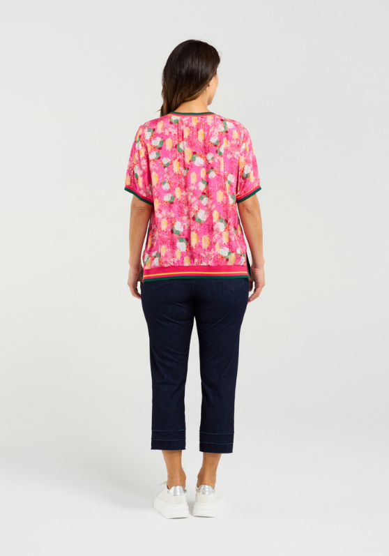 This easygoing top features a relaxed silhouette enhanced by elastic trim detailing at the neckline, cuffs, and hem, offering subtle shape and a comfortable fit. The design is brought to life with a lively pink base adorned with multicolored accents, adding a playful and artistic touch.