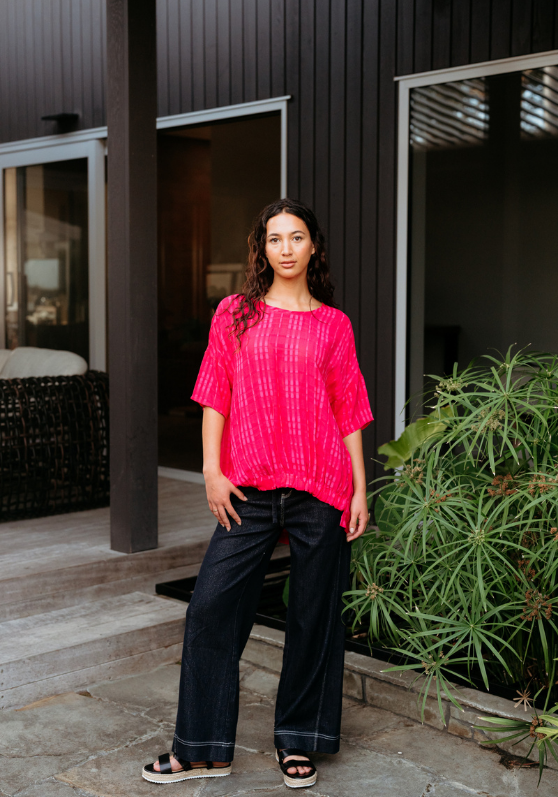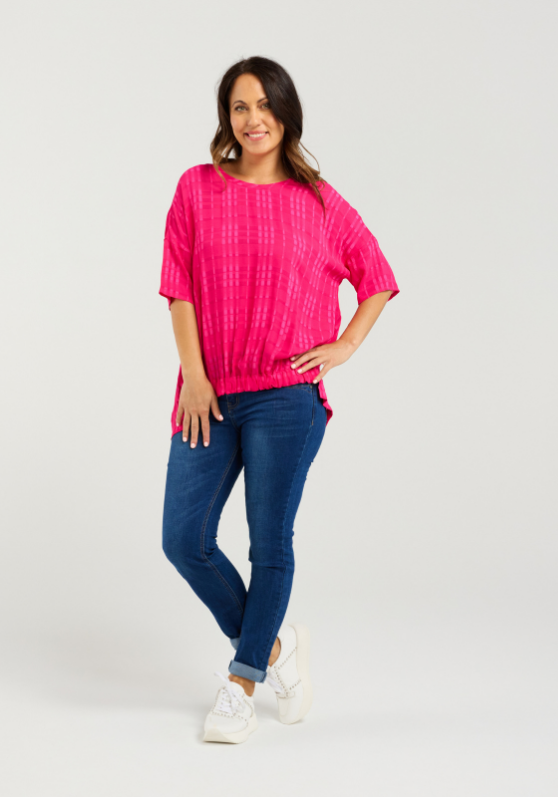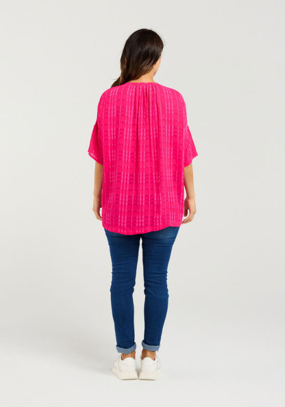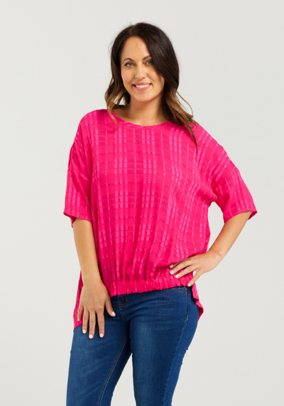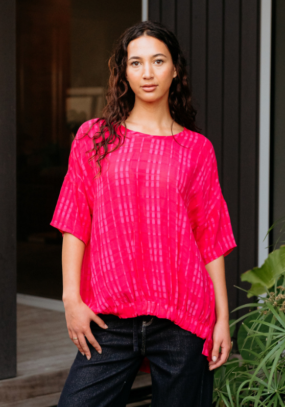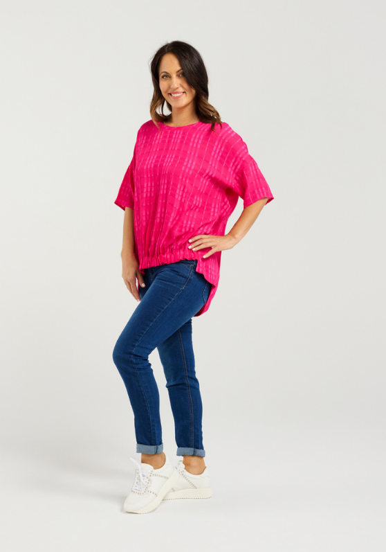 Our timeless top with a gathered front waistband and slightly longer finish in the back with a subtle plaid as an added detail.