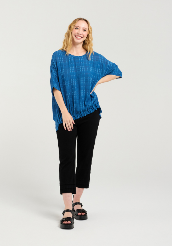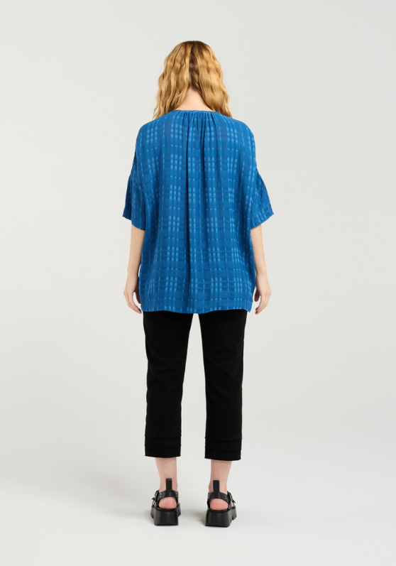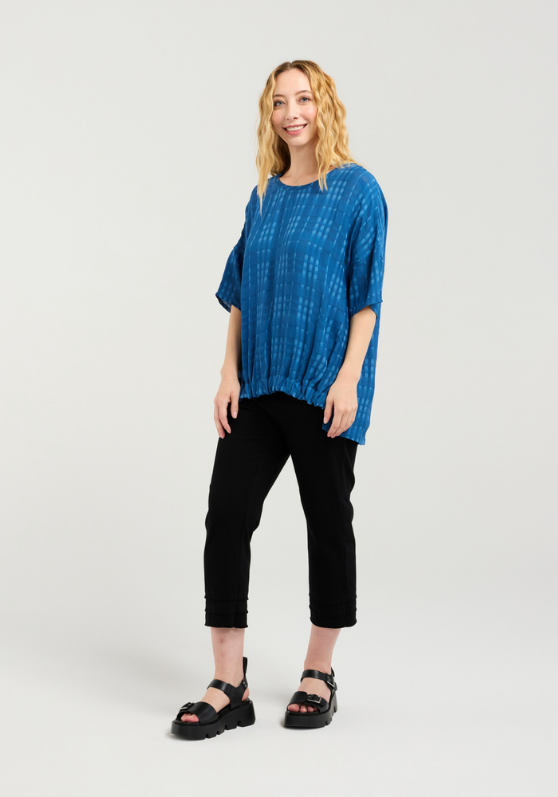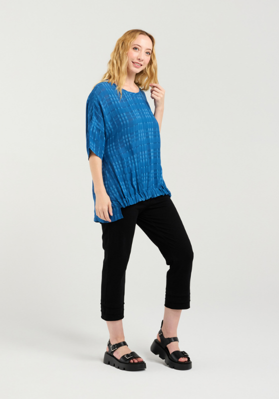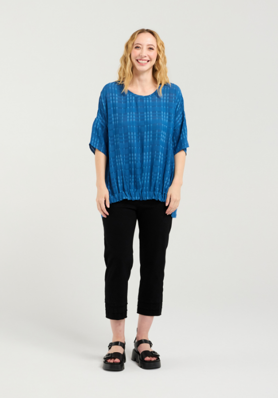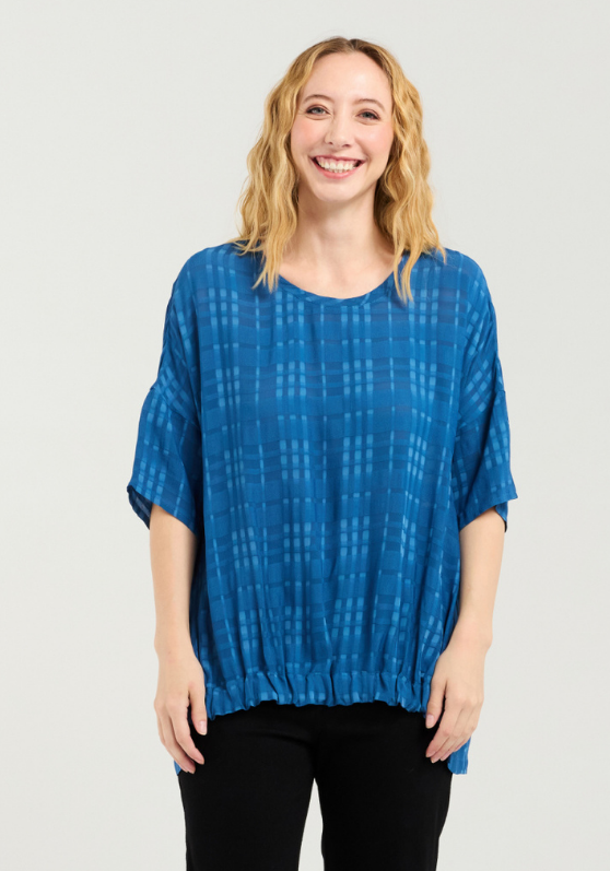 Our timeless top with a gathered front waistband and slightly longer finish in the back with a subtle plaid as an added detail.
