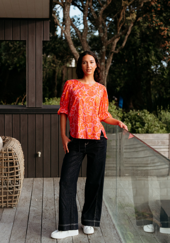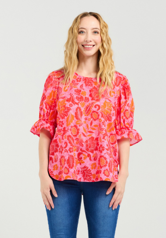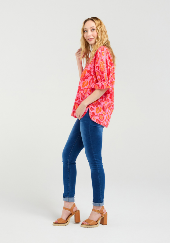 This charming top maintains its relaxed fit and round neckline, with short frilled sleeves adding a delicate, feminine touch. A subtle lace detail on the back enhances the design with an elegant finish. The vibrant red and pink floral motif brings a lively and romantic flair, making it perfect for brightening up any wardrobe.