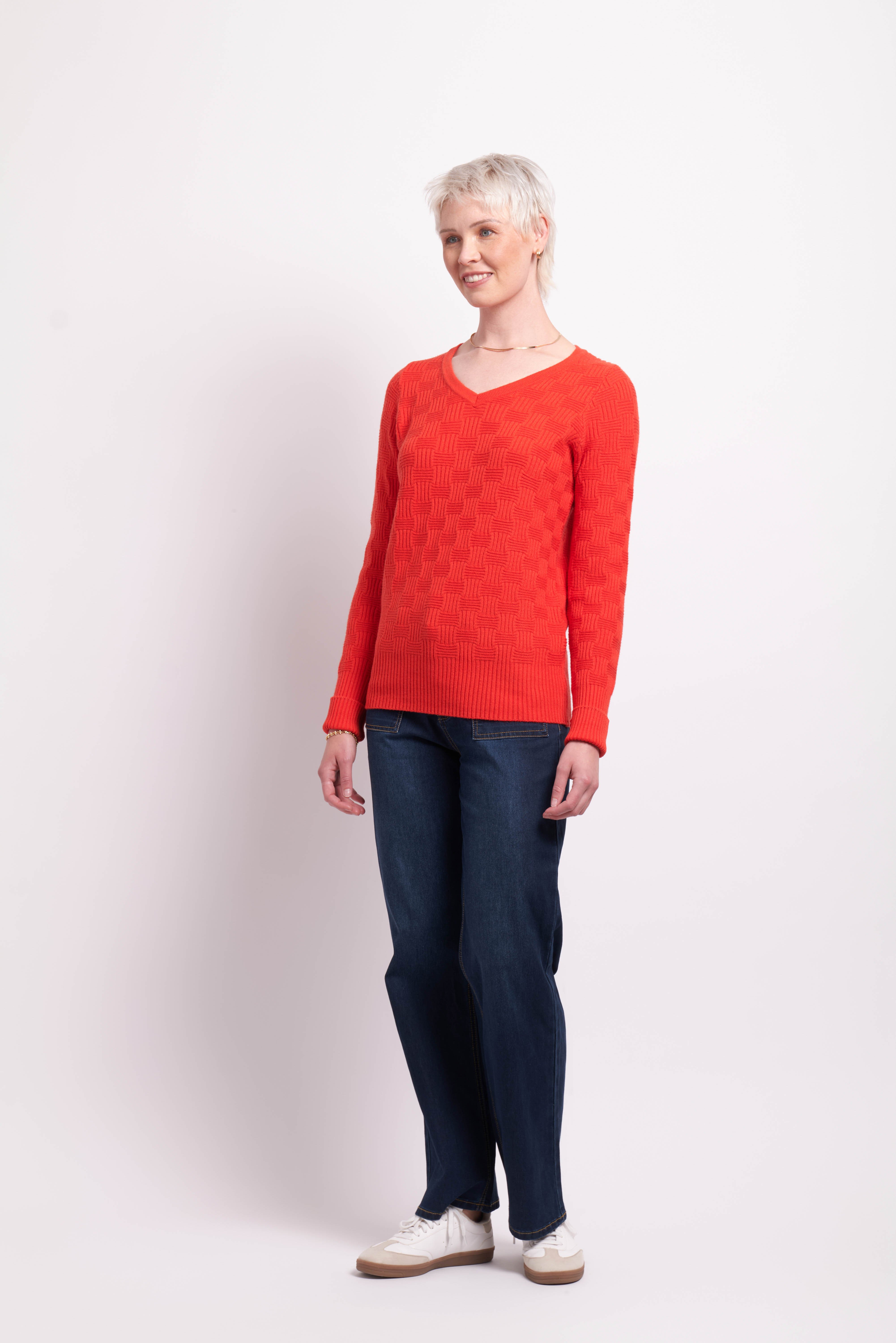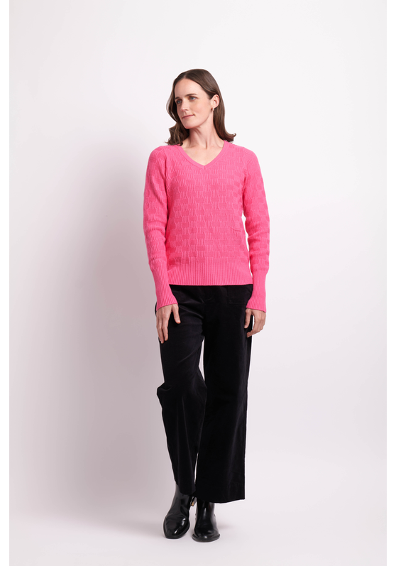 Elevate your wardrobe with our V-neck sweater. Featuring a distinctive textured design and long rib cuffs, it combines style and comfort flawlessly.